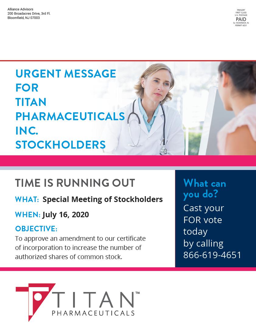 Alliance Advisors 200 Broadacres Drive, 3rd Fl. Bloomfield, NJ 07003 TIME IS RUNNING OUT What: Special Meeting of Stockholders When: July 16, 2020 Objective: To approve an amendment to our certificate of incorporation to increase the number of authorized shares of common stock. Urgent Message for Titan Pharmaceuticals Inc. Sto ckholders What can you do? Cast your FOR vote today by calling 866-619-4651