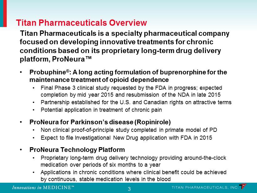 3 Titan Pharmaceuticals Overview Titan Pharmaceuticals is a specialty pharmaceutical company focused on developing innovative treatments for chronic conditions based on its proprietary long - term drug delivery platform, ProNeura ™ • Probuphine ® : A long acting formulation of buprenorphine for the maintenance treatment of opioid dependence • Final Phase 3 clinical study requested by the FDA in progress; expected completion by mid year 2015 and resubmission of the NDA in late 2015 • Partnership established for the U.S. and Canadian rights on attractive terms • Potential application in treatment of chronic pain • ProNeura for Parkinson’s disease ( Ropinirole ) • Non clinical proof - of - principle study completed in primate model of PD • Expect to file Investigational New Drug application with FDA in 2015 • ProNeura Technology Platform • Proprietary long - term drug delivery technology providing around - the - clock medication over periods of six months to a year • Applications in chronic conditions where clinical benefit could be achieved by continuous, stable medication levels in the blood