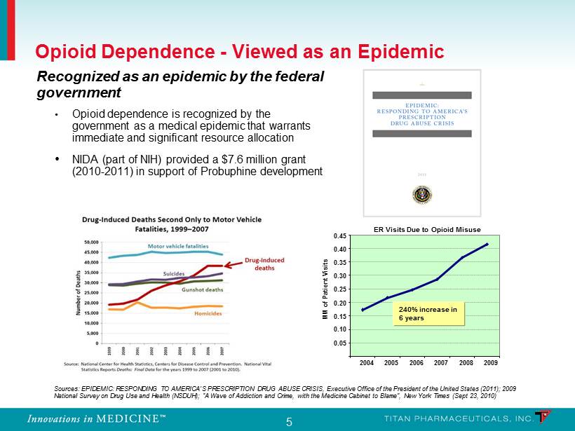 4 Probuphine : Highlights Probuphine is expected to be the first long acting buprenorphine product on the market for the treatment of opioid dependence • Probuphine provides six month sustained release of buprenorphine, a drug already on the market as a daily dosed sublingual tablet/film • Expanding market with U.S. sales of daily dosed buprenorphine products exceeding $1.5 billion; Probuphine peak sales potential: $300 - $500 mil • Strong U.S. and Canadian partnership with Braeburn Pharmaceuticals • Upfront : $15.75 mil; Approval: $15 mil; Sales Milestones: $165 mil; • Tiered royalties: mid teens – low twenties • U.S. patent life to 2024 • Potential application in treating chronic pain • Regulatory status: • NDA accepted for Priority Review in January 2013 and FDA Advisory Committee voted in favor of approval of Probuphine in March 2013 • FDA issued a Complete Response Letter (CRL) on April 30, 2013 requesting additional clinical testing • Final clinical study in progress and resubmission of NDA expected in late 2015