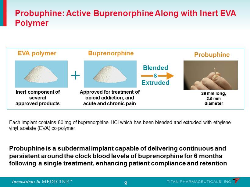 8 • Daily buprenorphine is the current gold standard • U.S. sales of daily oral formulations of buprenorphine ( Suboxone ®) exceeded $1.4B in 2012 • U.S. buprenorphine prescriptions have far outstripped those of methadone since 2006 • Challenges with oral buprenorphine • Compliance • Fluctuating levels of drug • Diversion, abuse Source: IMS Health Opioid Dependence - Expanding Market 0 200 400 600 800 1000 1200 1400 1600 2008 2009 2010 2011 2012 Suboxone Brand Gross Sales 2008 - 2012