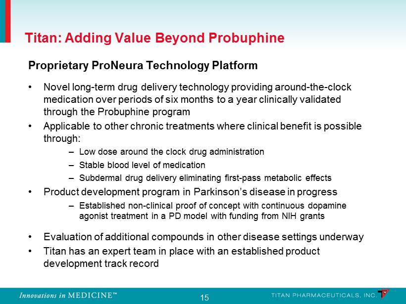 15 Titan: Adding Value Beyond Probuphine Proprietary ProNeura Technology Platform • Novel long - term drug delivery technology providing around - the - clock medication over periods of six months to a year clinically validated through the Probuphine program • Applicable to other chronic treatments where clinical benefit is possible through: – Low dose around the clock drug administration – Stable blood level of medication – Subdermal drug delivery eliminating first - pass metabolic effects • Product development program in Parkinson’s disease in progress – Established non - clinical proof of concept with continuous dopamine agonist treatment in a PD model with funding from NIH grants • Evaluation of additional compounds in other disease settings underway • Titan has an expert team in place with an established product development track record