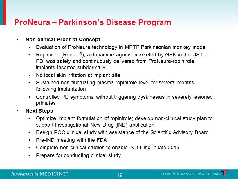 18 Parkinson’s Disease: Therapeutics Market Source: GlobalData Sales for PD in the US by Drug Class 2012 – 2022 Year Total PD Sales % DA $ DA 2012 $1.1 bn 26% 286m 2022 $2.3bn 18% 414m About 1.5 million people in the U.S. have Parkinson’s disease according to the Parkinson’s Disease Foundation. The number is expected to double by 2030 because of the aging population. Sales of Dopamine Agonists, US Based on information from Titan and other sources believed to be reliable and prepared exclusively for Titan. Woodside Capita l P artners is not responsible for any use that Titan may make of this material.