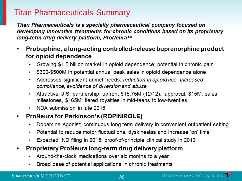 19 ProNeura – Parkinson’s Disease Program • Non - clinical Proof of Concept • E valuation of ProNeura technology in MPTP Parkinsonian monkey model • Ropinirole (Requip ® ), a dopamine agonist marketed by GSK in the US for PD, was safely and continuously delivered from ProNeura - ropinirole implants inserted subdermally • No local skin irritation at implant site • Sustained non - fluctuating plasma ropinirole level for several months following implantation • C ontrolled PD symptoms without triggering dyskinesias in severely lesioned primates • Next Steps • Optimize implant formulation of ropinirole ; develop non - clinical study plan to support Investigational New Drug (IND) application • Design POC clinical study with assistance of the Scientific Advisory Board • P re - IND meeting with the FDA • Complete non - clinical studies to enable IND filing in late 2015 • P repare for conducting clinical study