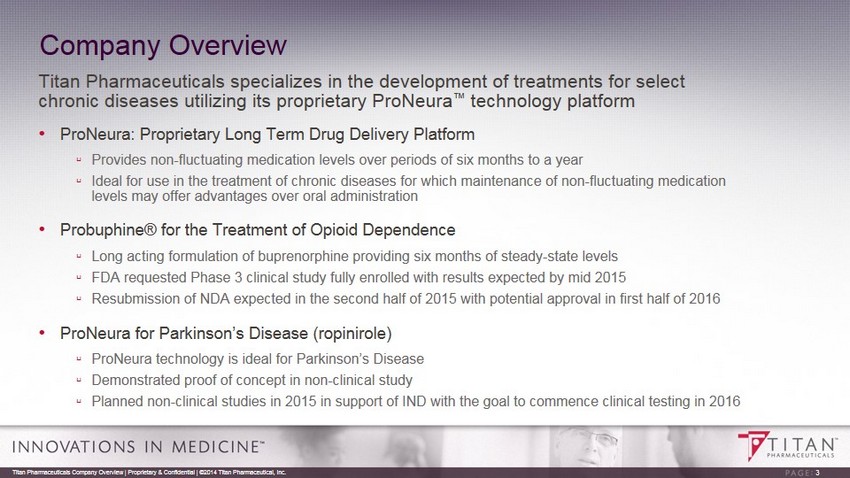 Safe Harbor The presentation may contain “forward - looking statements” within the meaning of Section 27A of the Securities Act of 1933 and Section 21E of the Securities Exchange Act of 1934. Reference is made in particular to the description of our plans and objectives for future operations, assumptions underlying such plans and objectives and other forward - looking terminology such as “may,” “expects,” “believes,” “anticipates,” “intends,” “projects,” or similar terms, variations of such terms or the negative of such terms. Forward - looking statements are based on management’s current expectations. Actual results could differ materially from those currently anticipated and such statements involve risks and uncertainties, including, but not limited to, those risks and uncertainties relating to availability of financing, difficulties or delays in development, testing, regulatory approval, production and marketing of the Company's drug candidates, adverse side effects or inadequate therapeutic efficacy of the Company's drug candidates that could slow or prevent product development or commercialization and the uncertainty of patent protection for the Company's intellectual property or trade secrets. Titan Pharmaceuticals Company Overview | Proprietary & Confidential | ©2014 Titan Pharmaceutical, Inc. 2