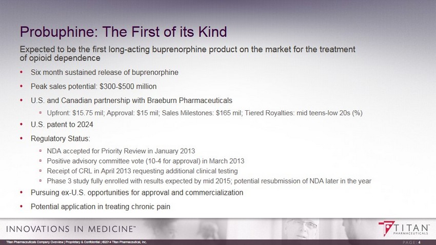 Company Overview Titan Pharmaceuticals specializes in the development of treatments for select chronic diseases utilizing its proprietary ProNeura ™ technology platform • ProNeura : Proprietary Long Term Drug Delivery Platform ▫ Provides non - fluctuating medication levels over periods of six months to a year ▫ Ideal for use in the treatment of chronic diseases for which maintenance of non - fluctuating medication levels may offer advantages over oral administration • Probuphine ® for the Treatment of Opioid Dependence ▫ Long acting formulation of buprenorphine providing six months of steady - state levels ▫ FDA requested Phase 3 clinical study fully enrolled with results expected by mid 2015 ▫ Resubmission of NDA expected in the second half of 2015 with potential approval in first half of 2016 • ProNeura for Parkinson’s Disease ( r opinirole ) ▫ ProNeura technology is ideal for Parkinson’s Disease ▫ Demonstrated proof of concept in non - clinical study ▫ Planned non - clinical studies in 2015 in support of IND with the goal to commence clinical testing in 2016 Titan Pharmaceuticals Company Overview | Proprietary & Confidential | ©2014 Titan Pharmaceutical, Inc. 3