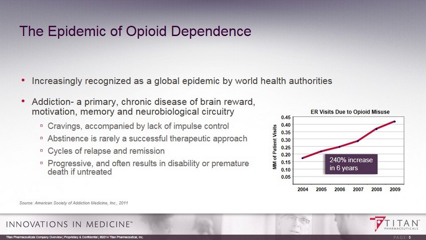 Probuphine: The First of its Kind Expected to be the first long - acting buprenorphine product on the market for the treatment of opioid dependence • Six month sustained release of buprenorphine • Peak sales potential: $300 - $500 million • U.S. and Canadian partnership with Braeburn Pharmaceuticals ▫ Upfront: $15.75 mil; Approval: $15 mil; Sales Milestones: $165 mil; Tiered Royalties: mid teens - low 20s (%) • U.S. patent to 2024 • Regulatory Status: ▫ NDA accepted for Priority Review in January 2013 ▫ Positive advisory committee vote (10 - 4 for approval) in March 2013 ▫ Receipt of CRL in April 2013 requesting additional clinical testing ▫ Phase 3 study fully enrolled with results expected by mid 2015; potential resubmission of NDA later in the year • Pursuing ex - U.S. opportunities for approval and commercialization • Potential application in treating chronic pain 4 Titan Pharmaceuticals Company Overview | Proprietary & Confidential | ©2014 Titan Pharmaceutical, Inc.