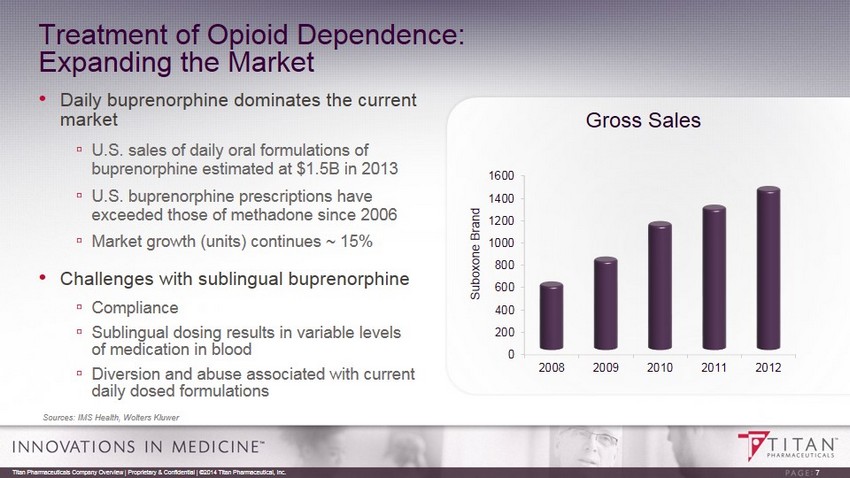 Opioid Dependence: Treatment Overview Buprenorphine is the Gold Standard in the U.S., Replacing Methadone • Buprenorphine pharmacology makes it an effective, safer and more convenient treatment option ▫ Controls withdrawal symptoms and cravings without inducing opioid euphoria in patients ▫ Convenient outpatient treatment allowing take home medication, unlike methadone ▫ Low risk of respiratory depression compared to other opiates * American Society of Addiction Medicine, Inc., 2011 Titan Pharmaceuticals Company Overview | Proprietary & Confidential | ©2014 Titan Pharmaceutical, Inc. 6