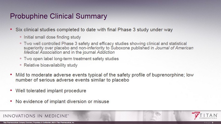 EVA polymer Buprenorphine Blended & Extruded Probuphine Proprietary ProNeura Technology: Probuphine Implant • Implant contains 80 mg of buprenorphine HCl , uniformly distributed throughout the ethylene vinyl acetate co - polymer (EVA) matrix • No reservoir, therefore no risk of drug dumping • Following subdermal placement Probuphine implant delivers non - fluctuating, stable blood levels of buprenorphine for 6 months; expected to enhance patient compliance and retention 8 Titan Pharmaceuticals Company Overview | Proprietary & Confidential | ©2014 Titan Pharmaceutical, Inc. 26 mm long ,2.5mm diameter