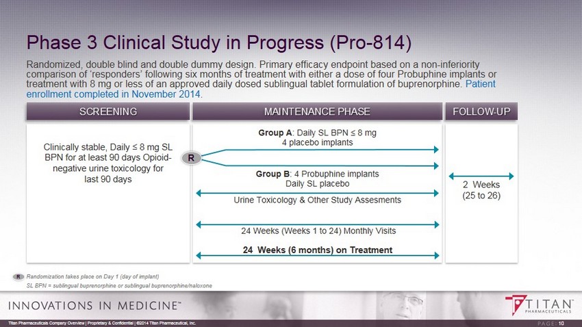 Probuphine Clinical Summary • Six clinical studies completed to date with final Phase 3 study under way ▫ Initial small dose finding study ▫ Two well controlled Phase 3 safety and efficacy studies showing clinical and statistical superiority over placebo and non - inferiority to Suboxone published in Journal of American Medical Association and in the journal Addiction ▫ Two open label long - term treatment safety studies ▫ Relative bioavailability study • Mild to moderate adverse events typical of the safety profile of buprenorphine; low number of serious adverse events similar to placebo • Well tolerated implant procedure • No evidence of implant diversion or misuse Titan Pharmaceuticals Company Overview | Proprietary & Confidential | ©2014 Titan Pharmaceutical, Inc. 9