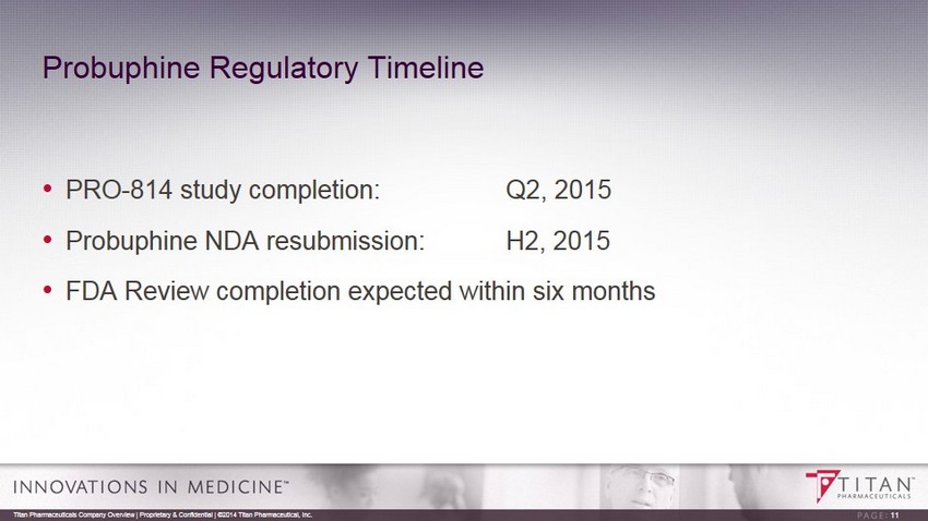 Phase 3 Clinical Study in Progress (Pro - 814) Randomized , double blind and double dummy design. Primary efficacy endpoint based on a non - inferiority comparison of ‘responders’ following six months of treatment with either a dose of four Probuphine implants or treatment with 8 mg or less of an approved daily dosed sublingual tablet formulation of buprenorphine . Patient enrollment completed in November 2014 . 10 Titan Pharmaceuticals Company Overview | Proprietary & Confidential | ©2014 Titan Pharmaceutical, Inc. R FOLLOW - UP 24 Weeks (Weeks 1 to 24 ) Monthly Visits Group A : Daily SL BPN ≤ 8 mg 4 placebo implants SCREENING Clinically stable, Daily ≤ 8 mg SL BPN for at least 90 days Opioid - negative urine toxicology for last 90 days MAINTENANCE PHASE 2 Weeks (25 to 26) 24 Weeks (6 months) on Treatment Urine Toxicology & Other Study Assesments Group B : 4 Probuphine implants Daily SL placebo Randomization takes place on Day 1 (day of implant ) SL BPN = sublingual buprenorphine or sublingual buprenorphine/naloxone R