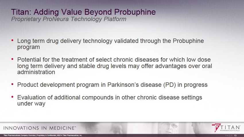 Probuphine Value Proposition Probuphine is the first and only potential treatment for opioid dependence that provides non - fluctuating blood levels of buprenorphine around - the - clock for a period of six months 12 Titan Pharmaceuticals Company Overview | Proprietary & Confidential | ©2014 Titan Pharmaceutical, Inc. Efficacy Effective in reducing illicit opioid use Safety Non - fluctuating drug exposure over six months may provide superior safety and tolerability Compliance Treatment with implant expected to enhance compliance Ease of Use Patients dosed once every six months in an outpatient setting Diversion Limited access to implants