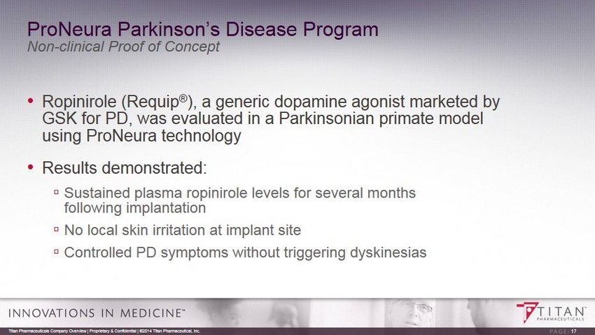 Therapeutics Market • As many as one million people in the US affected by Parkinson’s disease • The number expected to almost double by 2030 because of the aging population • About 60,000 newly diagnosed for Parkinson’s disease annually • More than 23,000 die from Parkinson’s disease each year 16 Titan Pharmaceuticals Company Overview | Proprietary & Confidential | ©2014 Titan Pharmaceutical, Inc. SALES OF DOPAMINE AGONISTS, US* YEAR TOTAL SALES % DA $ DA 2012 $1.1 bil 26% $286 m. 2022 $2.3 bil 18% $414 m. Sources: * GlobalData ; **Parkinson’s Action Network, National Center for Health Statistics; “The Current and Projected Economic Burden of Parkinso n’s Disease in the United States” Movement Disorders, March 2013 Based on information from Titan and other sources believed to be reliable and prepared exclusively for Titan. Woodside Capita l P artners is not responsible for any use that Titan may make of this material. $14.4 billion annually COST TO AMERICAN SOCIETY** Treatment Costs $8.1 billion Indirect Costs $6.3 billion If costs continue to rise they double by 2040