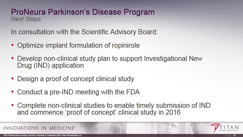 ProNeura Parkinson’s Disease Program Non - clinical Proof of Concept • Ropinirole ( Requip ® ), a generic dopamine agonist marketed by GSK for PD, was evaluated in a Parkinsonian primate model using ProNeura technology • Results demonstrated: ▫ Sustained plasma ropinirole levels for several months following implantation ▫ No local skin irritation at implant site ▫ Controlled PD symptoms without triggering dyskinesias 17 Titan Pharmaceuticals Company Overview | Proprietary & Confidential | ©2014 Titan Pharmaceutical, Inc.