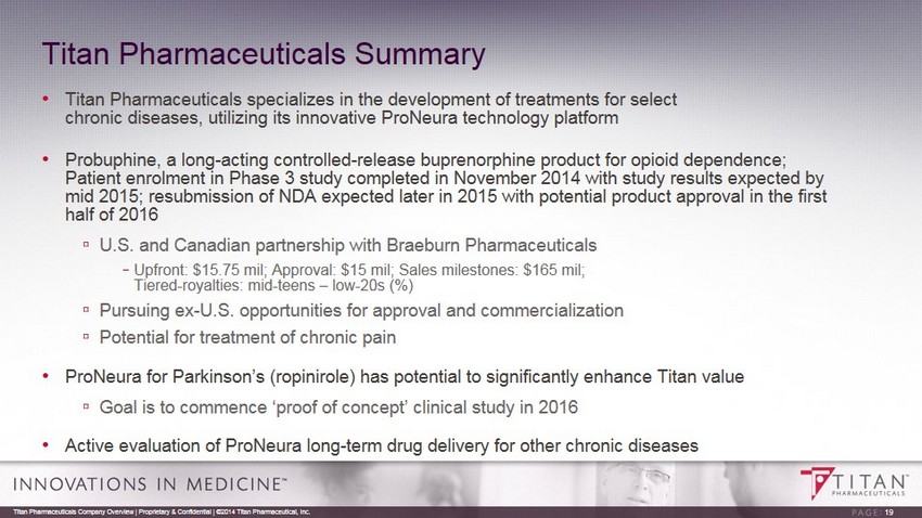 ProNeura Parkinson’s Disease Program Next Steps In consultation with the Scientific Advisory Board: • Optimize implant formulation of ropinirole • Develop non - clinical study plan to support Investigational New Drug (IND) application • Design a proof of concept clinical study • Conduct a pre - IND meeting with the FDA • Complete non - clinical studies to enable timely submission of IND and commence ‘proof of concept’ clinical study in 2016 18 Titan Pharmaceuticals Company Overview | Proprietary & Confidential | ©2014 Titan Pharmaceutical, Inc.