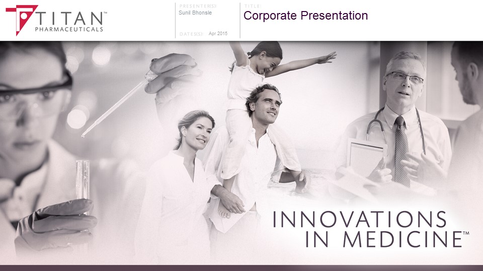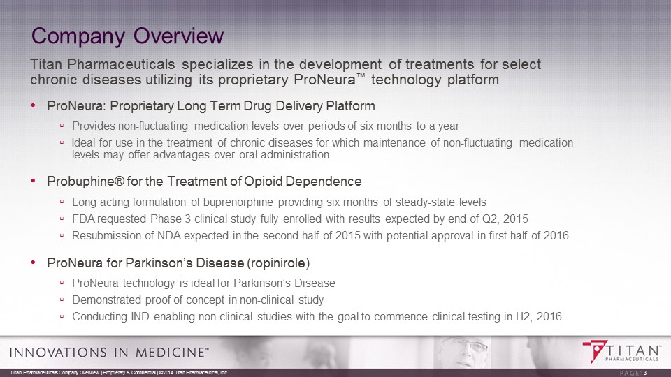 Safe Harbor The presentation may contain “forward - looking statements” within the meaning of Section 27A of the Securities Act of 1933 and Section 21E of the Securities Exchange Act of 1934. Reference is made in particular to the description of our plans and objectives for future operations, assumptions underlying such plans and objectives and other forward - looking terminology such as “may,” “expects,” “believes,” “anticipates,” “intends,” “projects,” or similar terms, variations of such terms or the negative of such terms. Forward - looking statements are based on management’s current expectations. Actual results could differ materially from those currently anticipated and such statements involve risks and uncertainties, including, but not limited to, those risks and uncertainties relating to availability of financing, difficulties or delays in development, testing, regulatory approval, production and marketing of the Company's drug candidates, adverse side effects or inadequate therapeutic efficacy of the Company's drug candidates that could slow or prevent product development or commercialization and the uncertainty of patent protection for the Company's intellectual property or trade secrets. Titan Pharmaceuticals Company Overview | Proprietary & Confidential | ©2014 Titan Pharmaceutical, Inc. 2