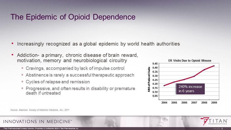 Probuphine: The First of its Kind Expected to be the first long - acting buprenorphine product on the market for the treatment of opioid dependence • Six month sustained release of buprenorphine • Peak sales potential: $300 - $500 million • U.S. and Canadian partnership with Braeburn Pharmaceuticals ▫ Upfront: $15.75 mil; Approval: $15 mil; Sales Milestones: $165 mil; Tiered Royalties: mid teens - low 20s (%) • U.S. patent to 2024 • Regulatory Status: ▫ NDA accepted for Priority Review in January 2013 ▫ Positive advisory committee vote (10 - 4 for approval) in March 2013 ▫ Receipt of CRL in April 2013 requesting additional clinical testing ▫ Phase 3 study results expected by end of Q2, 2015; potential resubmission of NDA later this year ▫ Potential approval in H1, 2016 • Pursuing ex - U.S. opportunities for approval and commercialization • Potential application in treating chronic pain 4 Titan Pharmaceuticals Company Overview | Proprietary & Confidential | ©2014 Titan Pharmaceutical, Inc.