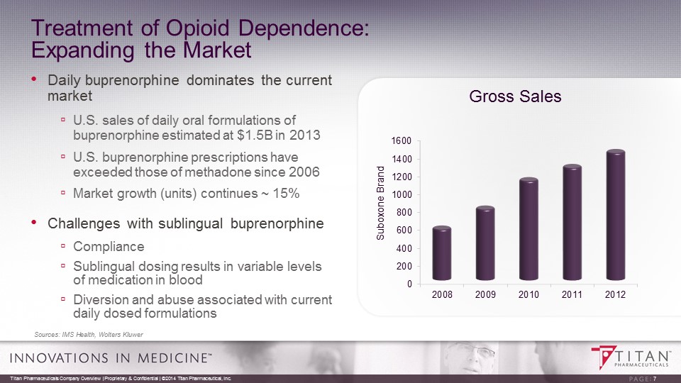 Opioid Dependence: Treatment Overview Buprenorphine is the Gold Standard in the U.S., Replacing Methadone • Buprenorphine pharmacology makes it an effective, safer and more convenient treatment option ▫ Controls withdrawal symptoms and cravings without inducing opioid euphoria in patients ▫ Convenient outpatient treatment allowing take home medication, unlike methadone ▫ Low risk of respiratory depression compared to other opiates * American Society of Addiction Medicine, Inc., 2011 Titan Pharmaceuticals Company Overview | Proprietary & Confidential | ©2014 Titan Pharmaceutical, Inc. 6