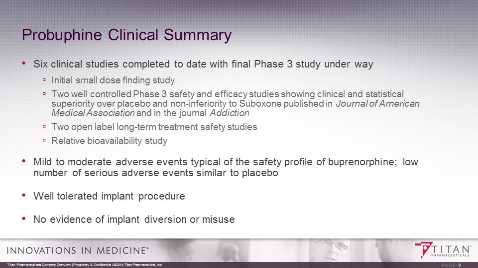 EVA polymer Buprenorphine Blended & Extruded Probuphine Proprietary ProNeura Technology: Probuphine Implant • Implant contains 80 mg of buprenorphine HCl , uniformly distributed throughout the ethylene vinyl acetate co - polymer (EVA) matrix • No reservoir, therefore no risk of drug dumping • Following subdermal placement Probuphine implant delivers non - fluctuating, stable blood levels of buprenorphine for 6 months; expected to enhance patient compliance and retention 8 Titan Pharmaceuticals Company Overview | Proprietary & Confidential | ©2014 Titan Pharmaceutical, Inc. 26 mm long ,2.5mm diameter