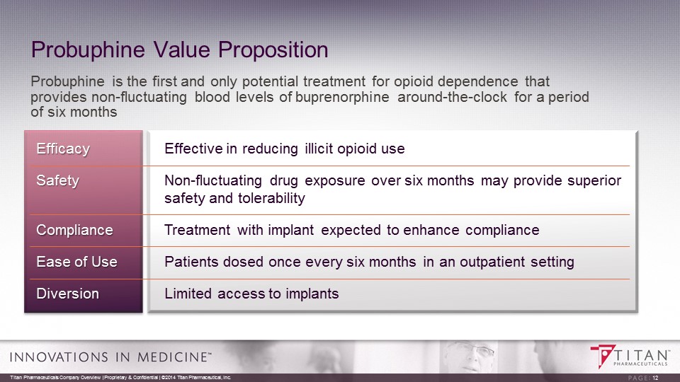 Probuphine Regulatory Timeline • PRO - 814 study completion: Q2, 2015 • Probuphine NDA resubmission: H2, 2015 • NDA continues to be under Priority Review • FDA Review completion expected within six months 11 Titan Pharmaceuticals Company Overview | Proprietary & Confidential | ©2014 Titan Pharmaceutical, Inc.