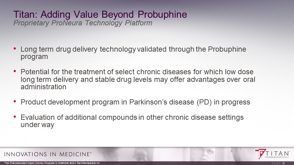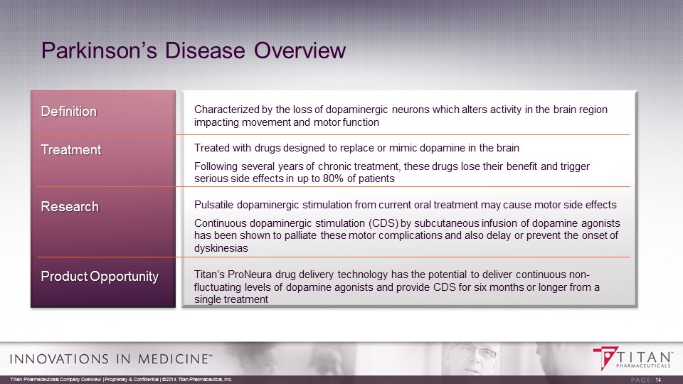 Titan: Adding Value Beyond Probuphine Proprietary ProNeura Technology Platform • Long term drug delivery technology validated through the Probuphine program • Potential for the treatment of select chronic diseases for which low dose long term delivery and stable drug levels may offer advantages over oral administration • Product development program in Parkinson’s disease (PD) in progress • Evaluation of additional compounds in other chronic disease settings under way 13 Titan Pharmaceuticals Company Overview | Proprietary & Confidential | ©2014 Titan Pharmaceutical, Inc.