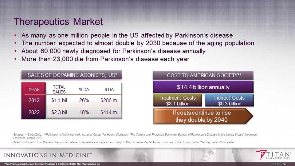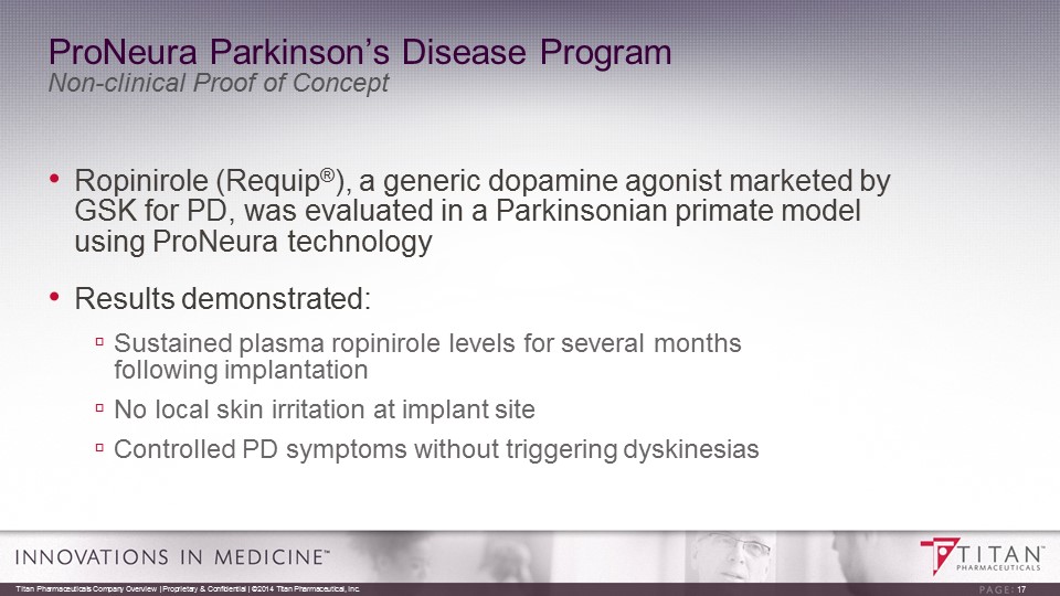 Therapeutics Market • As many as one million people in the US affected by Parkinson’s disease • The number expected to almost double by 2030 because of the aging population • About 60,000 newly diagnosed for Parkinson’s disease annually • More than 23,000 die from Parkinson’s disease each year 16 Titan Pharmaceuticals Company Overview | Proprietary & Confidential | ©2014 Titan Pharmaceutical, Inc. SALES OF DOPAMINE AGONISTS, US* YEAR TOTAL SALES % DA $ DA 2012 $1.1 bil 26% $286 m. 2022 $2.3 bil 18% $414 m. Sources: * GlobalData ; **Parkinson’s Action Network, National Center for Health Statistics; “The Current and Projected Economic Burden of Parkinso n’s Disease in the United States” Movement Disorders, March 2013 Based on information from Titan and other sources believed to be reliable and prepared exclusively for Titan. Woodside Capita l P artners is not responsible for any use that Titan may make of this material. $14.4 billion annually COST TO AMERICAN SOCIETY** Treatment Costs $8.1 billion Indirect Costs $6.3 billion If costs continue to rise they double by 2040