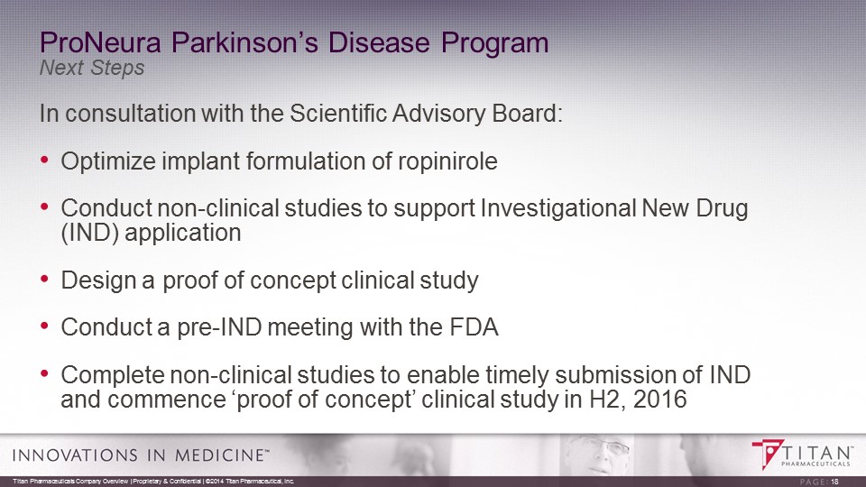 ProNeura Parkinson’s Disease Program Non - clinical Proof of Concept • Ropinirole ( Requip ® ), a generic dopamine agonist marketed by GSK for PD, was evaluated in a Parkinsonian primate model using ProNeura technology • Results demonstrated: ▫ Sustained plasma ropinirole levels for several months following implantation ▫ No local skin irritation at implant site ▫ Controlled PD symptoms without triggering dyskinesias 17 Titan Pharmaceuticals Company Overview | Proprietary & Confidential | ©2014 Titan Pharmaceutical, Inc.