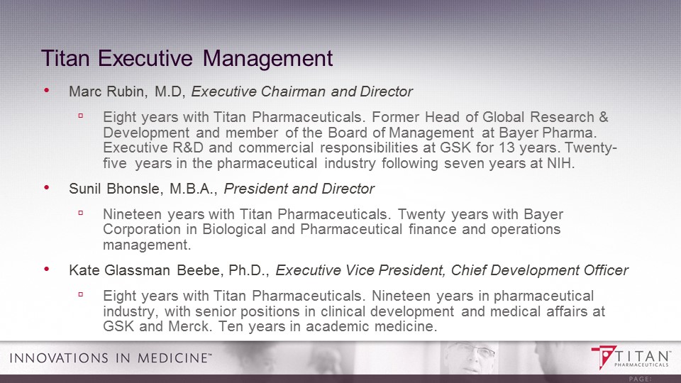 • Marc Rubin, M.D, Executive Chairman and Director ▫ Eight years with Titan Pharmaceuticals. Former Head of Global Research & Development and member of the Board of Management at Bayer Pharma. Executive R&D and commercial responsibilities at GSK for 13 years. Twenty - five years in the pharmaceutical industry following seven years at NIH. • Sunil Bhonsle , M.B.A., President and Director ▫ Nineteen years with Titan Pharmaceuticals. Twenty years with Bayer Corporation in Biological and Pharmaceutical finance and operations management. • Kate Glassman Beebe, Ph.D., Executive Vice President, Chief Development Officer ▫ Eight years with Titan Pharmaceuticals. Nineteen years in pharmaceutical industry, with senior positions in clinical development and medical affairs at GSK and Merck. Ten years in academic medicine. Titan Executive Management