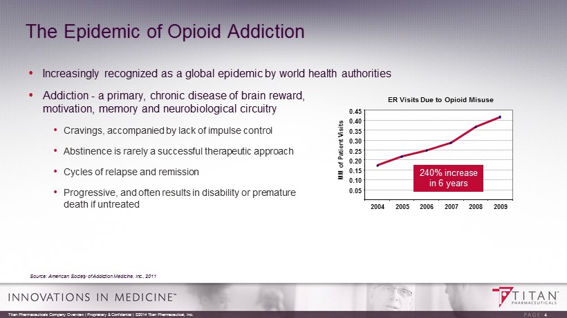 Company Overview Titan Pharmaceuticals specializes in the development of treatments for select chronic diseases utilizing its proprietary ProNeura ™ technology platform • ProNeura: Proprietary Long Term Drug Delivery Platform • Provides non - fluctuating medication levels over periods of three months to a year • Ideal for use in the treatment of chronic diseases for which maintenance of non - fluctuating medication levels may offer advantages over oral administration • Probuphine® for the Treatment of Opioid Addiction • Long acting formulation of buprenorphine providing six months of steady - state levels • FDA requested final Phase 3 clinical study completed in June 2015 with strong positive results • Probuphine NDA resubmitted to FDA at the end of August 2015, with potential approval in Q1, 2016 • ProNeura for Parkinson’s Disease ( r opinirole) • Demonstrated non - clinical proof of concept in a parkinsonian primate model • Conducting IND enabling non - clinical studies with the goal to commence clinical testing in H2, 2016 Titan Pharmaceuticals Company Overview | Proprietary & Confidential | ©2014 Titan Pharmaceutical, Inc. 3