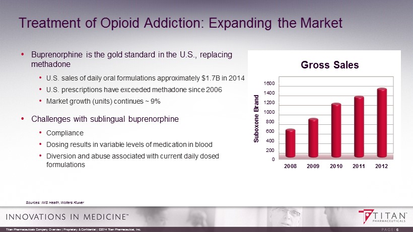 The Epidemic of Opioid Addiction • Increasingly recognized as a global epidemic by world health authorities • Addiction - a primary, chronic disease of brain reward, motivation, memory and neurobiological circuitry • Cravings, accompanied by lack of impulse control • Abstinence is rarely a successful therapeutic approach • Cycles of relapse and remission • Progressive, and often results in disability or premature death if untreated Source: American Society of Addiction Medicine, Inc., 2011 ER Visits Due to Opioid Misuse 0.05 0.10 0.15 0.20 0.25 0.30 0.35 0.40 0.45 2004 2005 2006 2007 2008 2009 MM of Patient Visits 240% increase in 6 years Titan Pharmaceuticals Company Overview | Proprietary & Confidential | ©2014 Titan Pharmaceutical, Inc. 4
