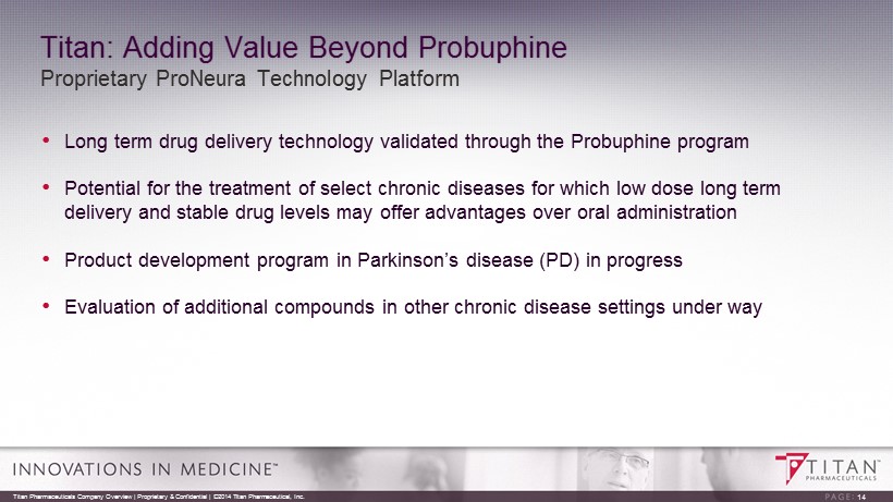 Probuphine : The First of its Kind • NDA resubmitted at the end of August, 2015 with potential approval by the FDA in Q1, 2016 • Peak sales potential: $300 - $500 mil in U.S. and partnership with Braeburn Pharmaceuticals for commercialization in U.S. and Canada • Upfront: $15.75 mil; Approval: $15 mil; Sales Milestones: $165 mil; Tiered Royalties: mid teens - low 20s (%) • U.S. patent to 2024 • Pursuing ex - U.S. opportunities for approval and commercialization in treatment of opioid addiction • Opportunity to develop Probuphine for treatment of chronic pain 13 Titan Pharmaceuticals Company Overview | Proprietary & Confidential | ©2014 Titan Pharmaceutical, Inc.