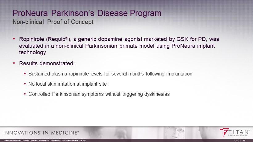 Parkinson’s Disease - Therapeutics Market • As many as one million people in the US affected by Parkinson’s disease • The number is expected to almost double by 2030 because of the aging population • About 60,000 newly diagnosed for Parkinson’s disease annually • More than 23,000 die from Parkinson’s disease each year 17 Titan Pharmaceuticals Company Overview | Proprietary & Confidential | ©2014 Titan Pharmaceutical, Inc. * GlobalData; **Parkinson’s Action Network, National Center for Health Statistics; “The Current and Projected Economic Burden of Parkinson’s Disease in the United States” Movement Disorders, March 2013 Based on information from Titan and other sources believed to be reliable and prepared exclusively for Titan. Woodside Capita l P artners is not responsible for any use that Titan may make of this material. Sales of Dopamine Agonists, U.S.* Year Total Sales % DA $ DA 2012 $1.1 Billion 26% $286 Million 2022 $2.3 Billion 18% $414 Million Cost to American Society ** $14.4 Billion Annually Treatment Costs $8.1 Billion Indirect Costs $6.3 Billion If costs continue to rise they will double by 2040