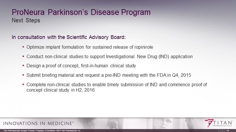 ProNeura Parkinson’s Disease Program Non - clinical Proof of Concept • Ropinirole (Requip ® ), a generic dopamine agonist marketed by GSK for PD, was evaluated in a non - clinical Parkinsonian primate model using ProNeura implant technology • Results demonstrated: • Sustained plasma ropinirole levels for several months following implantation • No local skin irritation at implant site • Controlled Parkinsonian symptoms without triggering dyskinesias 18 Titan Pharmaceuticals Company Overview | Proprietary & Confidential | ©2014 Titan Pharmaceutical, Inc.