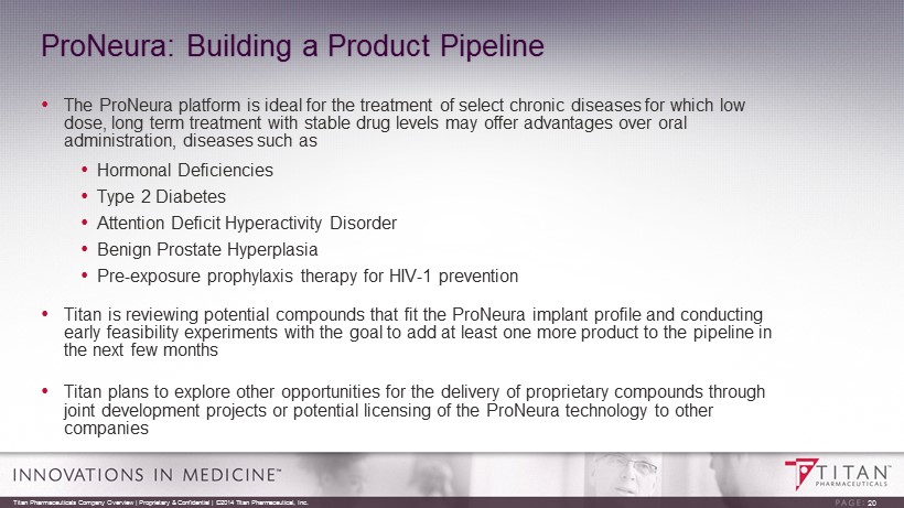 ProNeura Parkinson’s Disease Program Next Steps In consultation with the Scientific Advisory Board: • Optimize implant formulation for sustained release of ropinirole • Conduct non - clinical studies to support Investigational New Drug (IND) application • Design a proof of concept, first - in - human clinical study • Submit briefing material and request a pre - IND meeting with the FDA in Q4, 2015 • Complete non - clinical studies to enable timely submission of IND and commence proof of concept clinical study in H2, 2016 19 Titan Pharmaceuticals Company Overview | Proprietary & Confidential | ©2014 Titan Pharmaceutical, Inc.