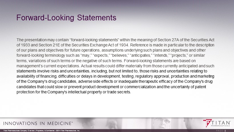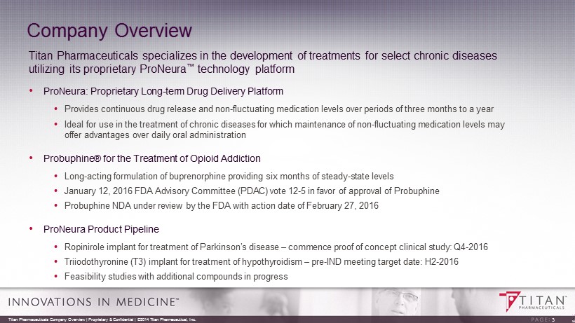 Forward - Looking Statements The presentation may contain “forward - looking statements” within the meaning of Section 27A of the Securities Act of 1933 and Section 21E of the Securities Exchange Act of 1934. Reference is made in particular to the description of our plans and objectives for future operations, assumptions underlying such plans and objectives and other forward - looking terminology such as “may,” “expects,” “believes,” “anticipates,” “intends,” “projects,” or similar terms, variations of such terms or the negative of such terms. Forward - looking statements are based on management’s current expectations. Actual results could differ materially from those currently anticipated and such statements involve risks and uncertainties, including, but not limited to, those risks and uncertainties relating to availability of financing, difficulties or delays in development, testing, regulatory approval, production and marketing of the Company's drug candidates, adverse side effects or inadequate therapeutic efficacy of the Company's drug candidates that could slow or prevent product development or commercialization and the uncertainty of patent protection for the Company's intellectual property or trade secrets. Titan Pharmaceuticals Company Overview | Proprietary & Confidential | ©2014 Titan Pharmaceutical, Inc. 2
