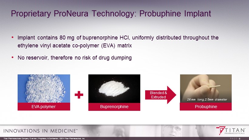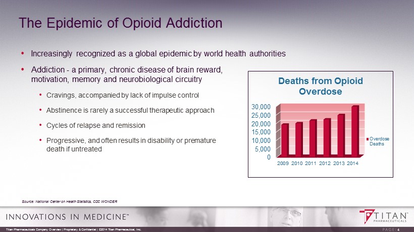 Company Overview Titan Pharmaceuticals specializes in the development of treatments for select chronic diseases utilizing its proprietary ProNeura ™ technology platform • ProNeura: Proprietary Long - term Drug Delivery Platform • Provides continuous drug release and non - fluctuating medication levels over periods of three months to a year • Ideal for use in the treatment of chronic diseases for which maintenance of non - fluctuating medication levels may offer advantages over daily oral administration • Probuphine® for the Treatment of Opioid Addiction • Long - acting formulation of buprenorphine providing six months of steady - state levels • January 12, 2016 FDA Advisory Committee (PDAC) vote 12 - 5 in favor of approval of Probuphine • Probuphine NDA under review by the FDA with action date of February 27, 2016 • ProNeura Product Pipeline • Ropinirole implant for treatment of Parkinson’s disease – commence proof of concept clinical study: Q4 - 2016 • Triiodothyronine (T3) implant for treatment of hypothyroidism – pre - IND meeting target date: H2 - 2016 • Feasibility studies with additional compounds in progress Titan Pharmaceuticals Company Overview | Proprietary & Confidential | ©2014 Titan Pharmaceutical, Inc. 3