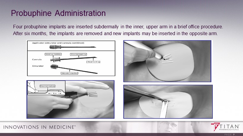 Buprenorphine Probuphine EVA polymer Proprietary ProNeura Technology: Probuphine Implant • Implant contains 80 mg of buprenorphine HCl, uniformly distributed throughout the ethylene vinyl acetate co - polymer (EVA) matrix • No reservoir, therefore no risk of drug dumping 6 Titan Pharmaceuticals Company Overview | Proprietary & Confidential | ©2014 Titan Pharmaceutical, Inc. 26 mm long ,2.5mm diameter Blended & Extruded