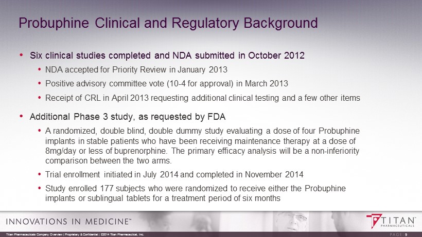 Probuphine Value Proposition Probuphine is the first and only potential treatment for opioid dependence that provides non - fluctuating blood levels of buprenorphine around - the - clock for a period of six months 8 Titan Pharmaceuticals Company Overview | Proprietary & Confidential | ©2014 Titan Pharmaceutical, Inc. Efficacy Effective in reducing illicit opioid use Safety Non - fluctuating drug exposure over six months may provide superior safety and tolerability Compliance Treatment with implant expected to enhance compliance Ease of Use Patients dosed once every six months in an outpatient setting Diversion Limited access to implants