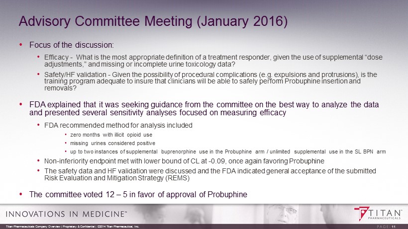 Positive Results From PRO 814 Phase 3 Study • Primary efficacy endpoint based on non - inferiority comparison of ‘responders’ following six months of treatment with either four Probuphine implants or 8 mg or less of an approved daily dosed sublingual tablet formulation of buprenorphine 10 Titan Pharmaceuticals Company Overview | Proprietary & Confidential | ©2014 Titan Pharmaceutical, Inc. 24 Weeks (Weeks 1 to 24 ) Monthly Visits Group A : Daily SL BPN ≤ 8 mg 4 placebo implants • Clinically stable patients • Daily ≤ 8 mg SL BPN for at least 90 days • Opioid - negative urine toxicology for last 90 days 2 Weeks ( 25 to 26) 24 Weeks (6 months) on Treatment Urine Toxicology & Other Study Assessments Group B : 4 Probuphine implants Daily SL placebo Randomization takes place on Day 1 (day of implant) SL BPN = sublingual buprenorphine or sublingual buprenorphine/naloxone Screening Maintenance Phase Follow - up R R Results: Probuphine SL BPN Proportion Difference(95% CI ) Superiority P value Responder - ITT population 81/84 (96%) 78/89 (88%) 0.088 (0.009, 0.167) 0.03 Responder - modified ITT 81/87 (93%) 78/89 (88%) 0.055 ( - 0.032, 0.141) 0.22