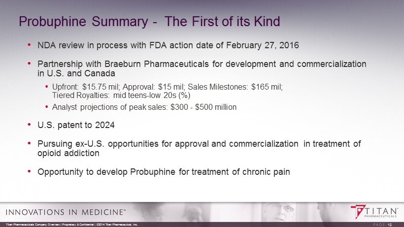 Advisory Committee Meeting (January 2016) • Focus of the discussion: • Efficacy - What is the most appropriate definition of a treatment responder, given the use of supplemental “dose adjustments,” and missing or incomplete urine toxicology data ? • Safety/HF validation - Given the possibility of procedural complications (e.g . expulsions and protrusions), is the training program adequate to insure that clinicians will be able to safely perform Probuphine insertion and removals ? • FDA explained that it was seeking guidance from the committee on the best way to analyze the data and presented several sensitivity analyses focused on measuring efficacy • FDA recommended method for analysis included • zero months with illicit opioid use • missing urines considered positive • up to two instances of supplemental buprenorphine use in the Probuphine arm / unlimited supplemental use in the SL BPN arm • N on - inferiority endpoint met with lower bound of CL at - 0.09, once again favoring Probuphine • The safety data and HF validation were discussed and the FDA indicated general acceptance of the submitted Risk Evaluation and Mitigation Strategy (REMS) • The committee voted 12 – 5 in favor of approval of Probuphine 11 Titan Pharmaceuticals Company Overview | Proprietary & Confidential | ©2014 Titan Pharmaceutical, Inc.
