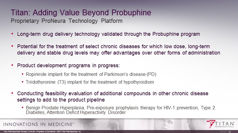 Probuphine Summary - The First of its Kind • NDA review in process with FDA action date of February 27, 2016 • Partnership with Braeburn Pharmaceuticals for development and commercialization in U.S. and Canada • Upfront: $15.75 mil; Approval: $15 mil; Sales Milestones: $165 mil; Tiered Royalties: mid teens - low 20s (%) • Analyst projections of peak sales: $300 - $500 million • U.S. patent to 2024 • Pursuing ex - U.S. opportunities for approval and commercialization in treatment of opioid addiction • Opportunity to develop Probuphine for treatment of chronic pain 12 Titan Pharmaceuticals Company Overview | Proprietary & Confidential | ©2014 Titan Pharmaceutical, Inc.