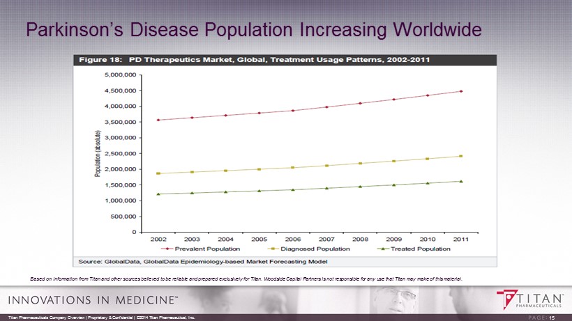. Titan Pharmaceuticals Company Overview | Proprietary & Confidential | ©2014 Titan Pharmaceutical, Inc. 14 Definition Characterized by the loss of dopamine, which alters activity in the brain region impacting movement and motor function Treatment Treated with drugs designed to replace or mimic dopamine in the brain Following several years of chronic treatment, these drugs lose their benefit and trigger serious side effects in up to 80% of patients Research Pulsatile dopaminergic stimulation from current oral treatment may cause motor side effects Continuous dopaminergic stimulation (CDS) by systemic infusion of dopamine replacement medications has been shown to palliate these motor complications and also delay or prevent the onset of dyskinesias Product Opportunity Titan’s ProNeura drug delivery technology has the potential to deliver continuous non - fluctuating levels of dopamine agonists and provide CDS for three months or longer from a single treatment Parkinson’s Disease Overview