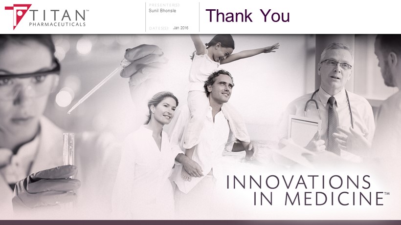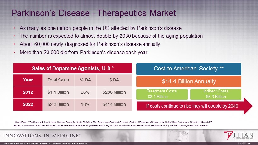 Parkinson’s Disease Population Increasing Worldwide 15 Based on information from Titan and other sources believed to be reliable and prepared exclusively for Titan. Woodside Capita l P artners is not responsible for any use that Titan may make of this material. Titan Pharmaceuticals Company Overview | Proprietary & Confidential | ©2014 Titan Pharmaceutical, Inc.
