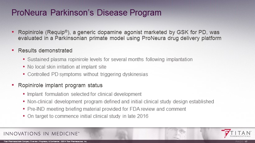Parkinson’s Disease - Therapeutics Market • As many as one million people in the US affected by Parkinson’s disease • The number is expected to almost double by 2030 because of the aging population • About 60,000 newly diagnosed for Parkinson’s disease annually • More than 23,000 die from Parkinson’s disease each year 16 Titan Pharmaceuticals Company Overview | Proprietary & Confidential | ©2014 Titan Pharmaceutical, Inc. * GlobalData; **Parkinson’s Action Network, National Center for Health Statistics; “The Current and Projected Economic Burden of Parkinson’s Disease in the United States” Movement Disorders, March 2013 Based on information from Titan and other sources believed to be reliable and prepared exclusively for Titan. Woodside Capita l P artners is not responsible for any use that Titan may make of this material. Sales of Dopamine Agonists, U.S.* Year Total Sales % DA $ DA 2012 $1.1 Billion 26% $286 Million 2022 $2.3 Billion 18% $414 Million Cost to American Society ** $14.4 Billion Annually Treatment Costs $8.1 Billion Indirect Costs $6.3 Billion If costs continue to rise they will double by 2040