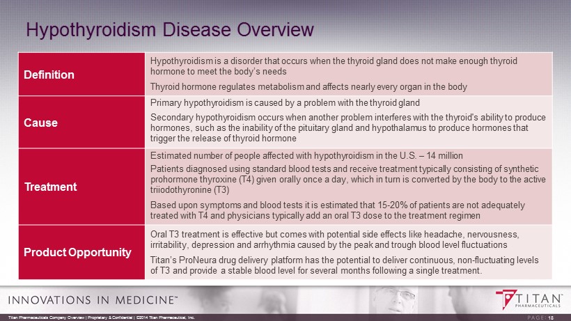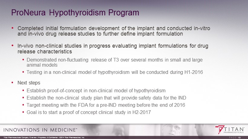 . Titan Pharmaceuticals Company Overview | Proprietary & Confidential | ©2014 Titan Pharmaceutical, Inc. 18 Definition Hypothyroidism is a disorder that occurs when the thyroid gland does not make enough thyroid hormone to meet the body’s needs Thyroid hormone regulates metabolism and affects nearly every organ in the body Cause Primary hypothyroidism is caused by a problem with the thyroid gland Secondary hypothyroidism occurs when another problem interferes with the thyroid's ability to produce hormones, such as the inability of the pituitary gland and hypothalamus to produce hormones that trigger the release of thyroid hormone Treatment Estimated number of people affected with hypothyroidism in the U.S. – 14 million Patients diagnosed using standard blood tests and receive treatment typically consisting of synthetic prohormone thyroxine (T4) given orally once a day, which in turn is converted by the body to the active triiodothyronine (T3) Based upon symptoms and blood tests it is estimated that 15 - 20% of patients are not adequately treated with T4 and physicians typically add an oral T3 dose to the treatment regimen Product Opportunity Oral T3 treatment is effective but comes with potential side effects like headache, nervousness, irritability, depression and arrhythmia caused by the peak and trough blood level fluctuations Titan’s ProNeura drug delivery platform has the potential to deliver continuous, non - fluctuating levels of T3 and provide a stable blood level for several months following a single treatment. Hypothyroidism Disease Overview
