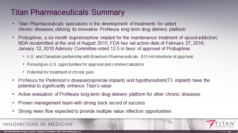 ProNeura Hypothyroidism Program • Completed initial formulation development of the implant and conducted in - vitro and in - vivo drug release studies to further define implant formulation • In - vivo non - clinical studies in progress evaluating implant formulations for drug release characteristics • Demonstrated non - fluctuating release of T3 over several months in small and large animal models • Testing in a non - clinical model of hypothyroidism will be conducted during H1 - 2016 • Next steps • Establish proof - of - concept in non - clinical model of hypothyroidism • Establish the non - clinical study plan that will provide safety data for the IND • Target meeting with the FDA for a pre - IND meeting before the end of 2016 • Goal is to start a proof of concept clinical study in H2 - 2017 19 Titan Pharmaceuticals Company Overview | Proprietary & Confidential | ©2014 Titan Pharmaceutical, Inc.