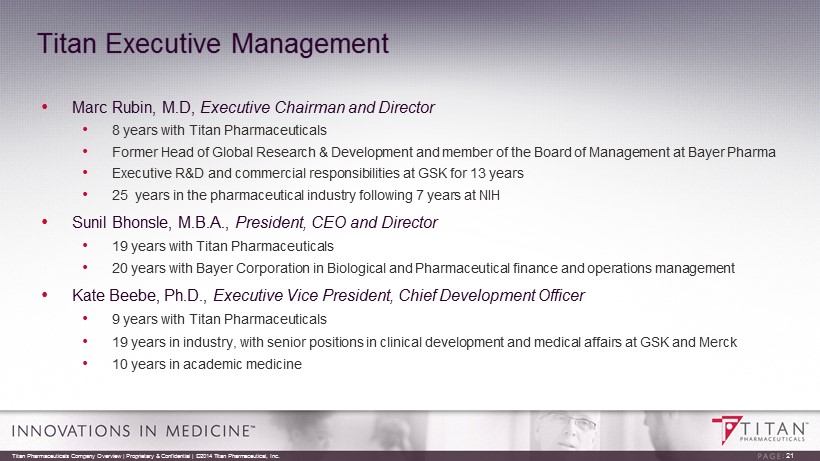 Titan Pharmaceuticals Summary • Titan Pharmaceuticals specializes in the development of treatments for select chronic diseases, utilizing its innovative ProNeura long term drug delivery platform • Probuphine, a six month buprenorphine implant for the maintenance treatment of opioid addiction; NDA resubmitted at the end of August 2015; FDA has set action date of February 27, 2016; January 12, 2016 Advisory Committee voted 12 - 5 in favor of approval of Probuphine • U.S. and Canadian partnership with Braeburn Pharmaceuticals - $15 mil milestone at approval • Pursuing ex - U.S. opportunities for approval and commercialization • Potential for treatment of chronic pain • ProNeura for Parkinson’s disease( ropinirole implant) and hypothyroidism(T3 implant) have the potential to significantly enhance Titan’s value • Active evaluation of ProNeura long - term drug delivery platform for other chronic diseases • Proven management team with strong track record of success • Strong news flow expected to provide multiple value inflection opportunities 20 Titan Pharmaceuticals Company Overview | Proprietary & Confidential | ©2014 Titan Pharmaceutical, Inc.
