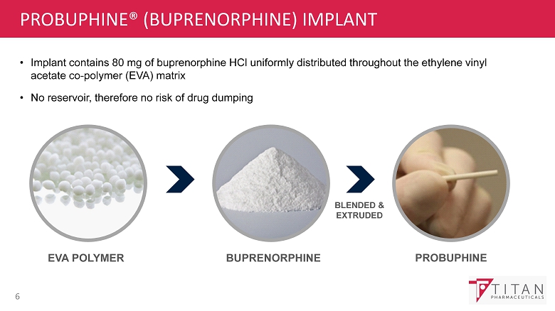 OPIOID ADDICTION: TREATMENT OVERVIEW 5 • Buprenorphine pharmacology makes it an effective, safer, and more convenient treatment option • Controls withdrawal symptoms and cravings without inducing opioid euphoria in patients • Convenient outpatient treatment allows take - home medication, unlike methadone • Low risk of respiratory depression versus other opiates • U.S . buprenorphine sales in 2015 almost $ 2 billion • Challenges with daily dosed formulations • Compliance • Sublingual dosing results in variable blood levels • Diversion and abuse $0 $500 $1,000 $1,500 $2,000 2009 2010 2011 2012 2013 2014 U.S. Buprenorphine Sales ($ Millions)