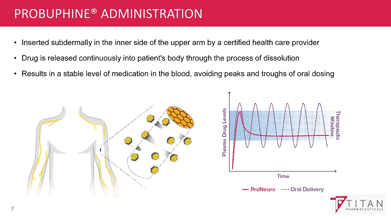 PROBUPHINE® (BUPRENORPHINE) IMPLANT 6 • Implant contains 80 mg of buprenorphine HCl uniformly distributed throughout the ethylene vinyl acetate co - polymer (EVA) matrix • No reservoir, therefore no risk of drug dumping EVA POLYMER BUPRENORPHINE PROBUPHINE BLENDED & EXTRUDED
