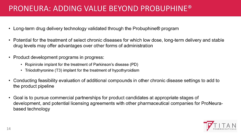 PROBUPHINE®: EX - U.S. PARTNERING PLANS 13 • Pursuing ex - U.S. opportunities in opioid addiction treatment • Progressing discussions with interested companies in select regions • Planning regulatory discussions with EMA and/or select European countries in second half of 2016 • Opportunity to further develop Probuphine® for treatment of chronic pain