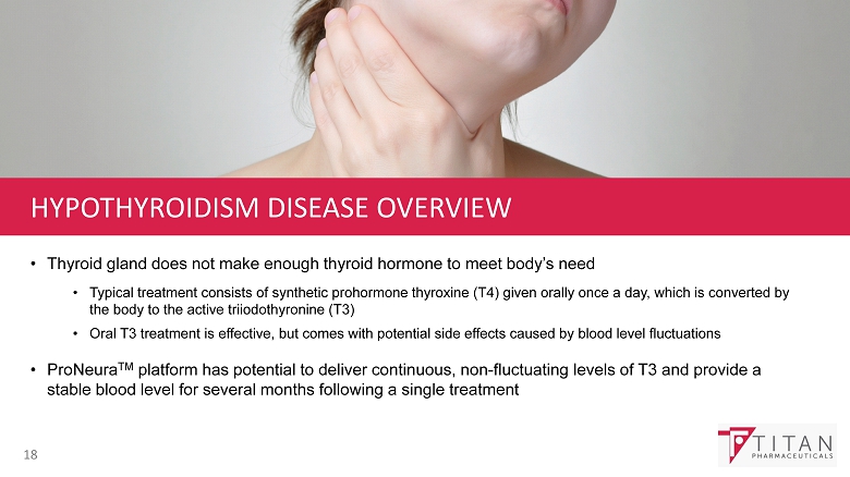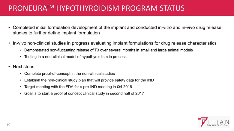 HYPOTHYROIDISM DISEASE OVERVIEW • Thyroid gland does not make enough thyroid hormone to meet body’s need • Typical treatment consists of synthetic prohormone thyroxine (T4) given orally once a day, which is converted by the body to the active triiodothyronine (T3) • Oral T3 treatment is effective, but comes with potential side effects caused by blood level fluctuations • ProNeura TM platform has potential to deliver continuous, non - fluctuating levels of T3 and provide a stable blood level for several months following a single treatment 18